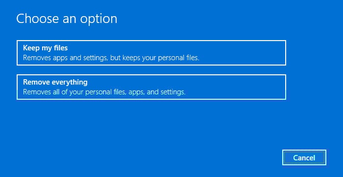 Se il tuo sistema operativo è precedente a Windows 10 build 18970 e il dispositivo non contiene una partizione di ripristino, il programma ti chiederà di inserire un supporto di installazione o ripristino di Windows. In alcuni casi, è necessario reimpostarlo da WinRE. Ecco, fai come dice. Successivamente, seleziona Mantieni i miei file o Rimuovi tutto in base alle tue preferenze. Mantieni i miei file: conserva i file all’interno della cartella Utenti (file utente). Rimuovi tutto: cancella completamente il sistema, l’applicazione e i file utente.