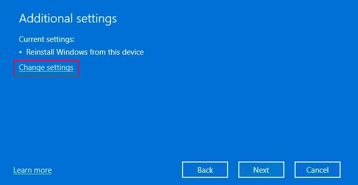 Quindi, scegli tra Download dal cloud e Reinstallazione locale (disponibile solo da Windows 10 build 18970 in poi). Download dal cloud: scarica l’immagine di Windows dal cloud. È necessario utilizzare questo metodo se il dispositivo non dispone di una partizione di ripristino. Inoltre, una connessione Internet attiva è un requisito fondamentale. Reinstallazione locale: utilizza l’immagine Windows nella partizione di ripristino per reimpostare il sistema operativo. Per i sistemi meno recenti, fai clic su Modifica impostazioni per accedere ad altre opzioni. In caso contrario, il programma fornirà altre opzioni nel normale processo.