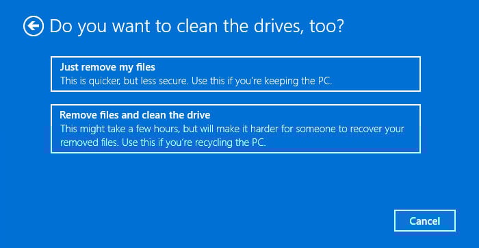 Se hai selezionato Rimuovi tutto, puoi scegliere se cancellare solo l’unità Windows o tutte le unità. Quindi, seleziona Rimuovi solo i miei file o Rimuovi file e pulisci completamente l’unità (Per i sistemi meno recenti, puoi abilitare/disabilitare Pulisci dati). La pulizia dell’unità in realtà elimina tutti i suoi dati. Se non lo abiliti, Windows segnerà semplicemente lo spazio precedentemente occupato come vuoto senza cancellarne il contenuto.