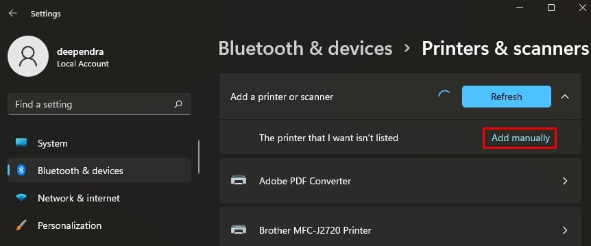 左側の [Bluetooth とデバイス] をクリックし、右側のペインで [プリンターとスキャナー] をクリックします。