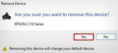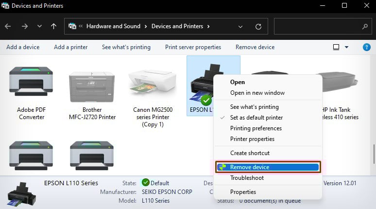 Epson プリンターを選択して右クリックし、[デバイスの削除] オプションを選択します。