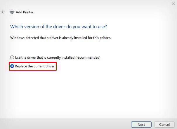 現在のドライバを置き換える オプションを選択して続行します。ドライバーを再インストールします。