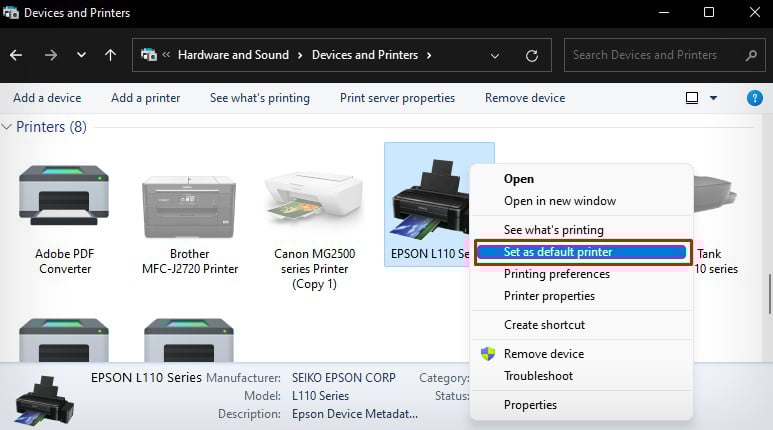 Epson プリンターを右クリックし、[通常使うプリンターに設定] オプションを選択します。
