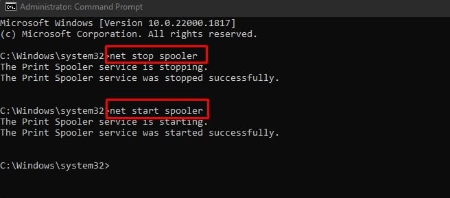 コマンド ウィンドウが開いたら、「net stop spooler」と入力して Enter キーを押します。 net start spooler と入力して Enter キーを押します。