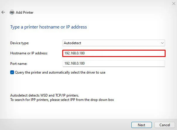IP アドレスを [ホスト名] フィールドに入力し、 次。