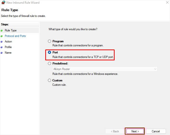 最初の画面で ポート を選択し、[次へ] をクリックします。