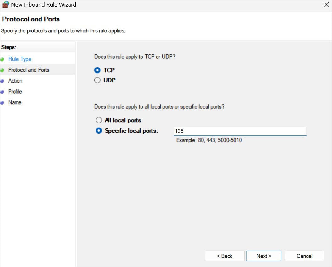 次に、TCP オプションがマークされていることを確認します。また、[特定のローカル ポート] フィールドにポート番号 135 を入力し、[次へ] をクリックします。