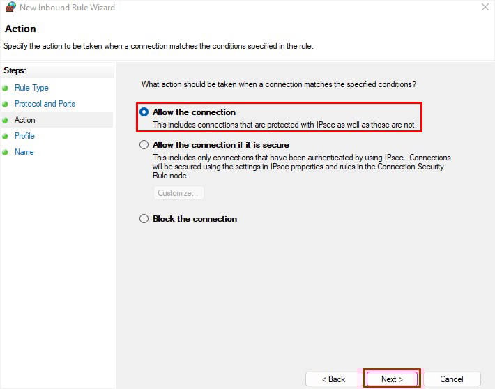 次に、[接続を許可する] が選択されていることを確認し、[次へ] をクリックします。