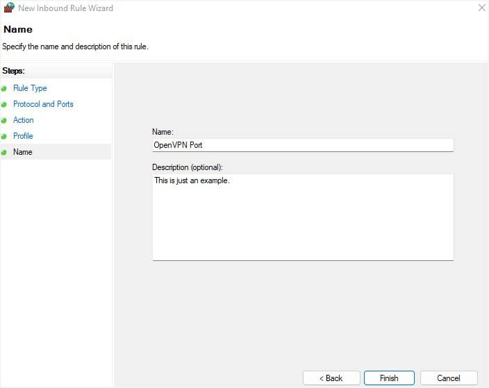 ここで、 設定した受信ルールに希望の名前と説明を入力できます。