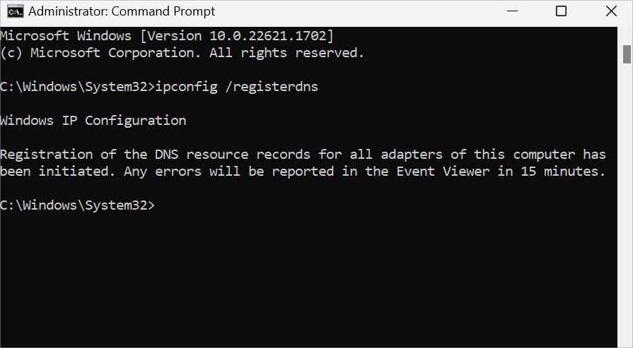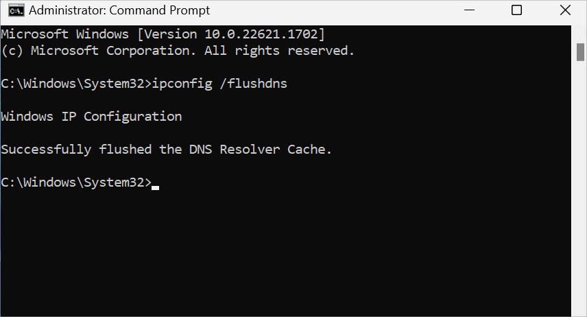 管理者権限を持つコマンド プロンプトで次のコマンドを入力し、 Enter キーを押してDNS キャッシュをフラッシュします: