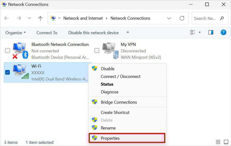[ネットワーク接続] ウィンドウにあるので、ネットワーク接続を右クリックし、プロパティを選択します。
