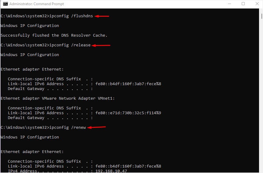 場合によっては、DNS レコード、TCP/IP スタック、さらには Winsock カタログが破損することがあります。これが発生すると、RPC サーバーも影響を受け、「RPC サーバーが利用できません」エラーが発生します。簡単な解決策は、以下に示すように、DNS キャッシュをフラッシュし、TCP/IP スタックと Winsock カタログの両方をリセットすることです。