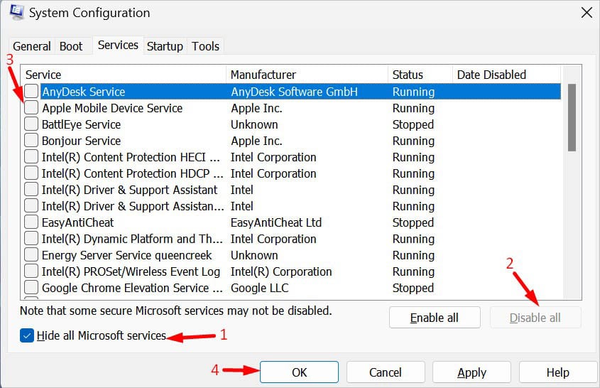前述したようにシステム構成ユーティリティを起動します。 [サービス] タブに切り替えます。ウィンドウの下部にある [すべての Microsoft サービスを非表示にする] オプションのチェックを外します。これで、サードパーティ サービスのみが残されます。