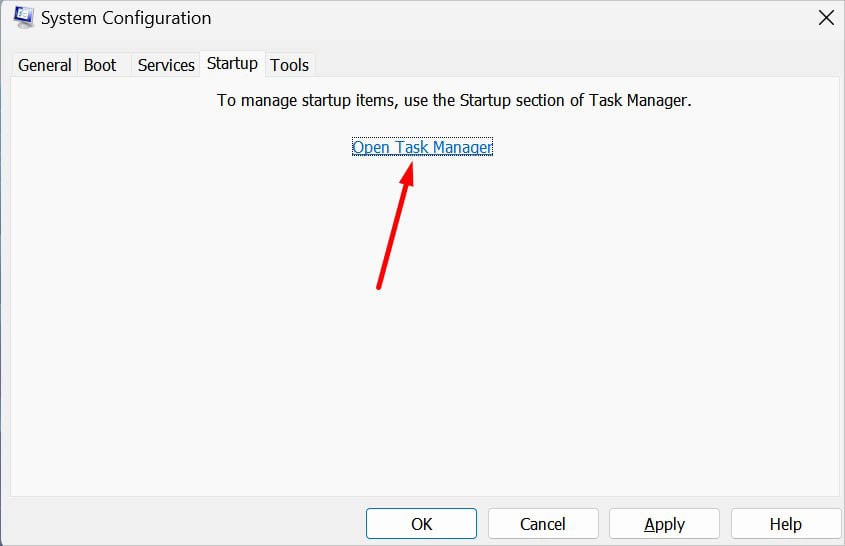 デフォルトでは、すべてのサービスがオンになっています。すべての項目のチェックを外すには、[すべて無効にする] ボタンをクリックします。次に、「OK」を押します。次に、[システム構成] ダイアログ ボックスを再度開きます。今回は、[スタートアップ] に移動し、[タスク マネージャーを開く] をクリックします。