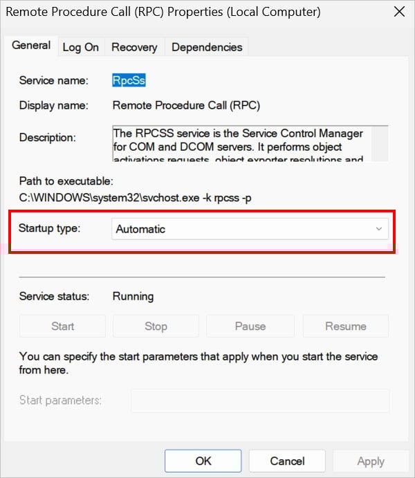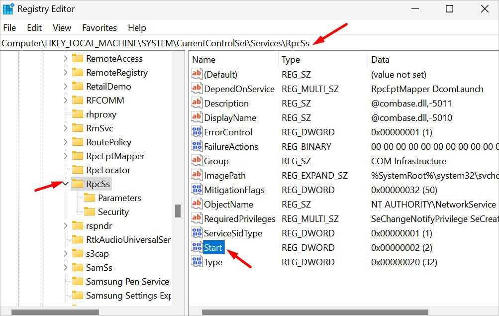 Computer\HKEY_LOCAL_MACHINE\SYSTEM\CurrentControlSet\Services\RpcSs 右側のセクションに移動し、 DWORD を開始します。