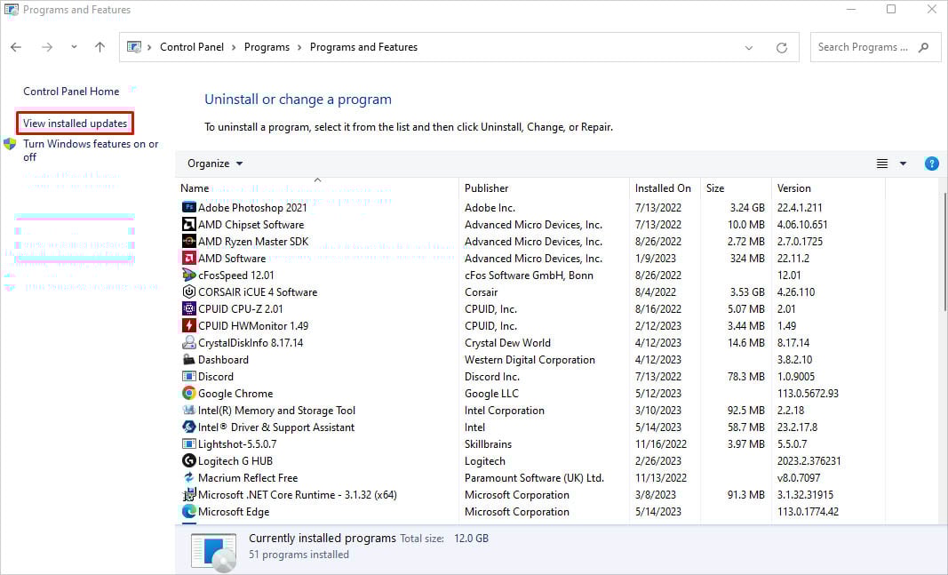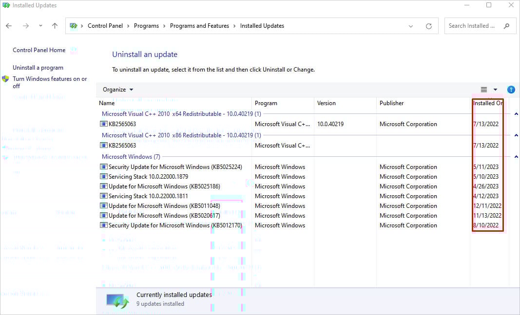 左側のセクションで [インストールされているアップデートを表示] をクリックします。