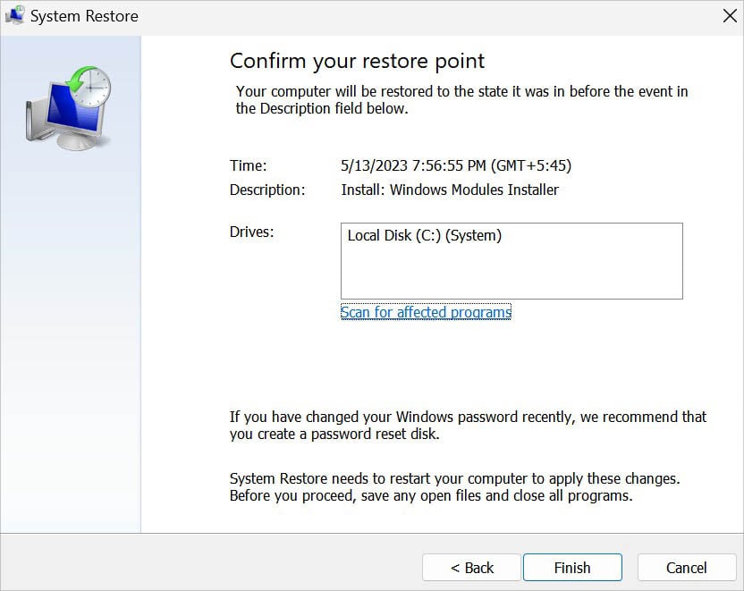 最近の Windows アップデートをアンインストールしても問題が解決しない場合は、システムを最新の状態に戻すことができます労働条件。技術的には、これはシステムの復元と呼ばれます。その方法は次のとおりです。