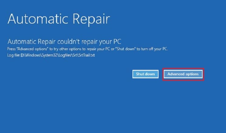 最初の手順 2 を繰り返して、 3 回クリックして自動修復を呼び出します。ブルー スクリーンで、[詳細オプション] ボタンを押します。