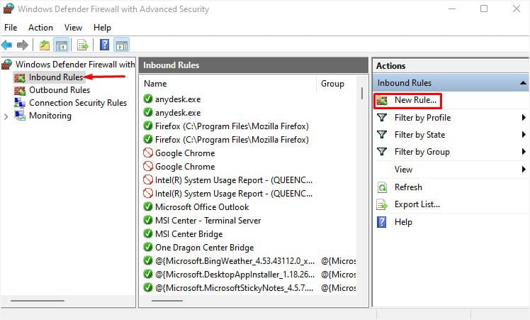 ツールを起動し、ウィンドウの左端のセクションから [受信ルール] を選択します。右ペインに切り替えて、新しいルールオプション。