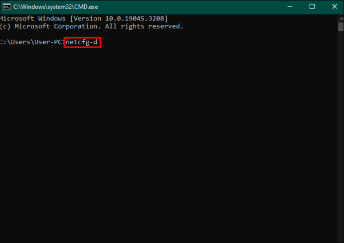 コマンド プロンプトで、コード「netcfg-」を入力します。 d”を入力してから、「Enter」を押します。