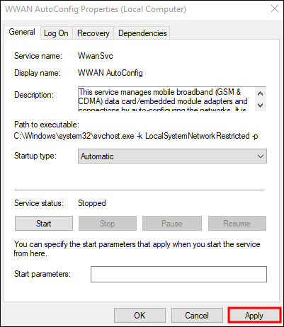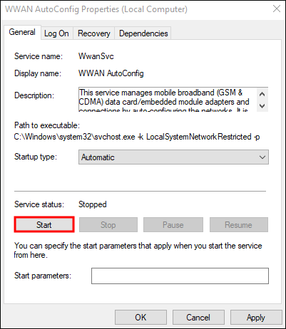 モバイル ブロードバンド サービスを使用する場合は、WWAN AutoConfig サービスが割り当てられていることを確認してください。