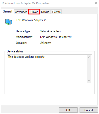 アダプターを見つけて、[プロパティ] をクリックし、[ドライバー] タブをクリックします。