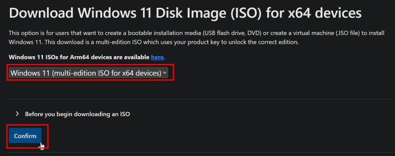 この公式Microsoft webページドロップダウンメニューから選択した言語「確認」をクリックします [strong]をクリックして、Windows 11 V25H2 ISOのダウンロードを開始します。このページでは、ISOファイルをダウンロードするための特別なリンクを作成できます。ここでは、「Windows 11 Disk Image(ISO)のダウンロード」セクションまで下にスクロールして、ドロップダウンメニューから「 Windows 11(Multi-Editions ISO)」オプションを選択し、「確認」をクリックして、「