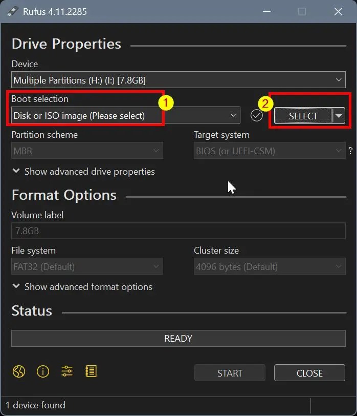上記のアクションによりRufusアプリが開きます。その中で、「デバイス」ドロップダウンメニューからUSBドライブを選択します。 USBドライブが表示されない場合は、プラグインしていることを確認してください。