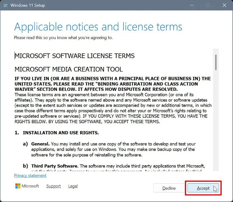 公式Microsoftダウンロードページに移動しますに移動し、「Windows 11インストールメディアの作成」セクションにスクロールダウンし、「 of downow downow 」ダブルクリックして開きます。開いたら、「 accept> accept> 」ボタンをクリックします。