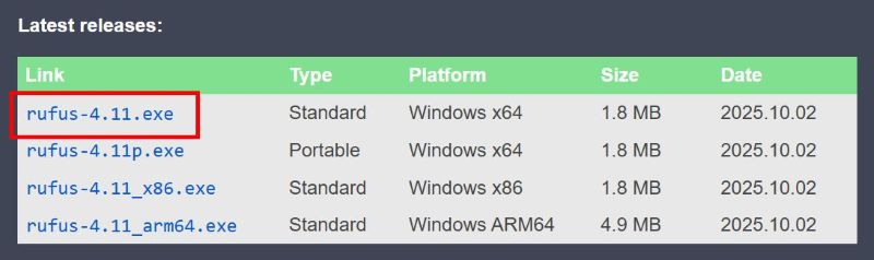 にに向かい、「rufus-4.xx.exe” link を「ダウンロード」セクションの下にクリックします。ファイルがダウンロードされたら、ファイルExplorerのダウンロードフォルダーで見つけます。ダブルクリック