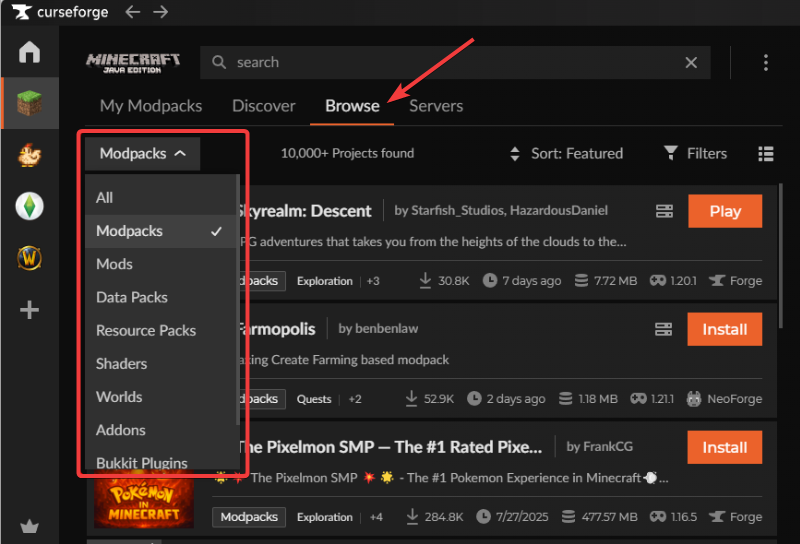 Minecraft が接続されたら、CurseForge 内に直接インストールできるようになります。 Modpack をインストールするには、[Minecraft] タブ → [Modpack の参照] に移動します。名前またはカテゴリで検索し、[インストール] をクリックし、完了したら [再生] をクリックします。