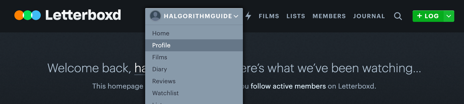 プロフィール メニューから日記にアクセスします。 日付、評価、 タイトルで並べ替えます。 このビューから直接エントリを編集または削除します。 プロメンバーは、「最も視聴された監督」や「トップジャンル」などの統計を表示できます。