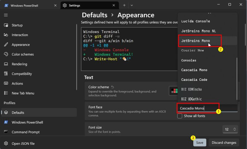 Windows ターミナルで特定のプロファイル/シェルのデフォルト フォントを変更する手順