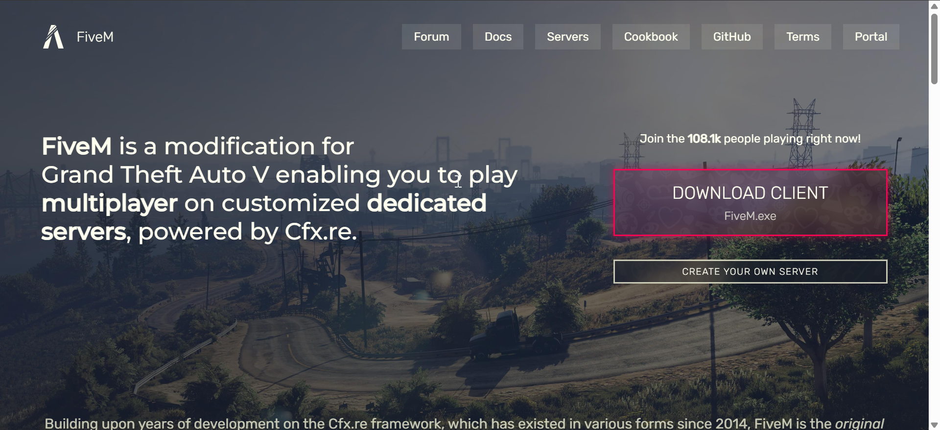 ブラウザを開いて、FiveM 公式 Web サイトにアクセスします。 [クライアントのダウンロード] をクリックし、プロンプトが表示されたらサービス利用規約に同意します。通常は FiveM.exe という名前のセットアップ ファイルのダウンロードが自動的に開始されます。