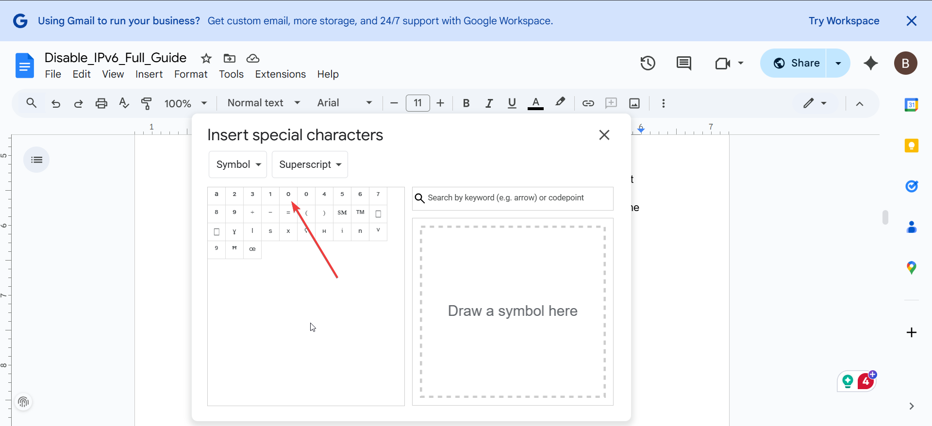 Google ドキュメントで、[挿入] > [記号] > [特殊文字] に移動します。検索ボックスに「度」と入力し、挿入する記号を選択します。