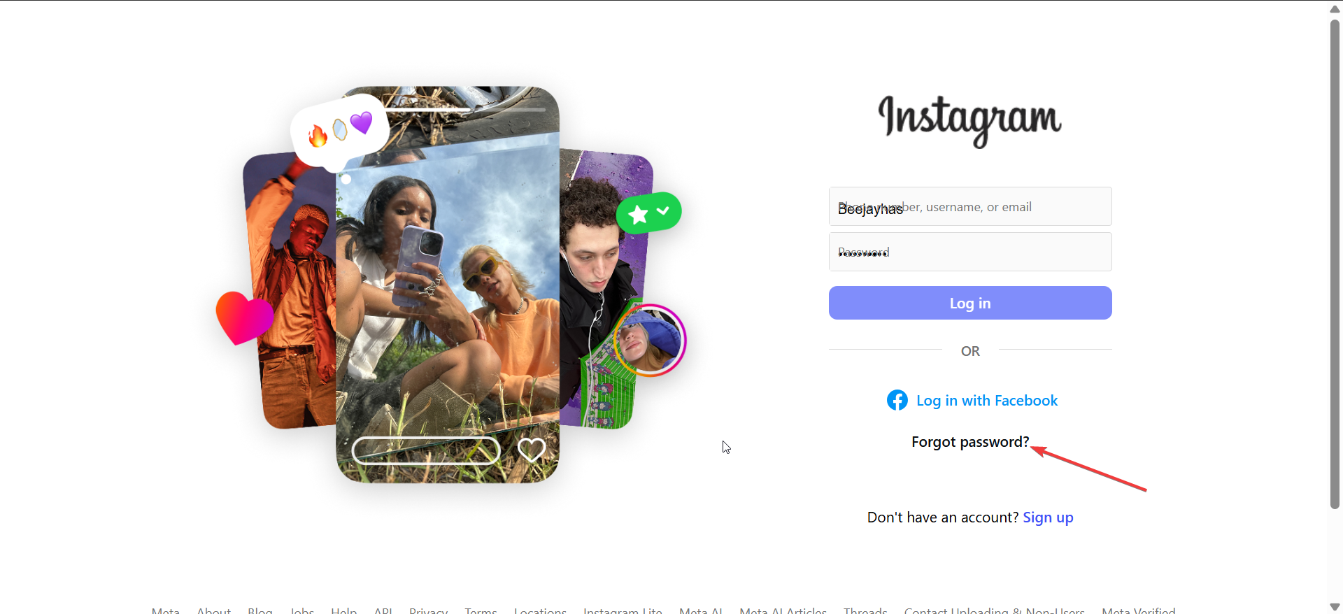登録したメールや電話にアクセスできない場合でも、ユーザー名または Facebook ログインを使用してアカウントを回復できます。 Instagram のログイン ページに移動し、[Facebook でログイン] オプションを選択するだけです。アカウントがリンクされている場合は、すぐにアクセスを回復できます。
