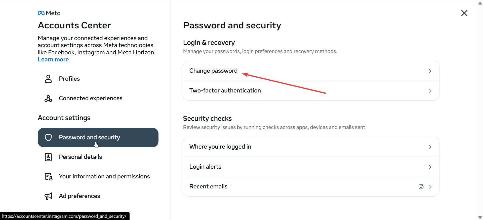 Instagram アプリで、プロフィール アイコン → メニュー (☰) → [設定とプライバシー] をタップします。次に、[アカウント センター] → [パスワードとセキュリティ] を選択してログインを確認します。