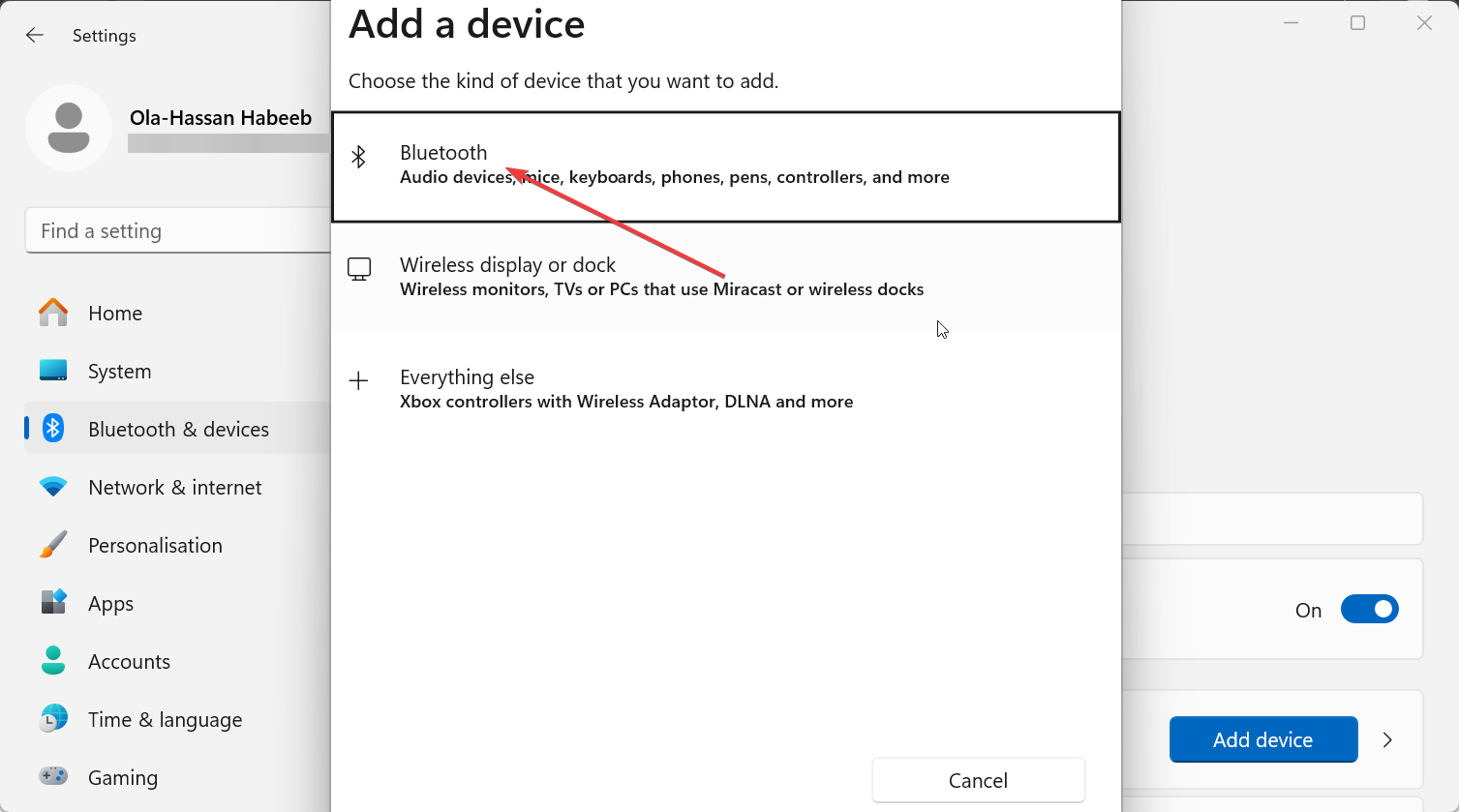 PC で、Bluetooth 設定の [デバイスの追加] をクリックし、Bluetooth を選択します。 Wii リモコン プラスの場合は、Nintendo RVL-CNT-01 または RVL-CNT-01-TR というラベルの付いたエントリを選択します。 PIN の入力を求められた場合は、スキップするか空白のままにしてください。 Windows はペアリングを自動的に完了します。