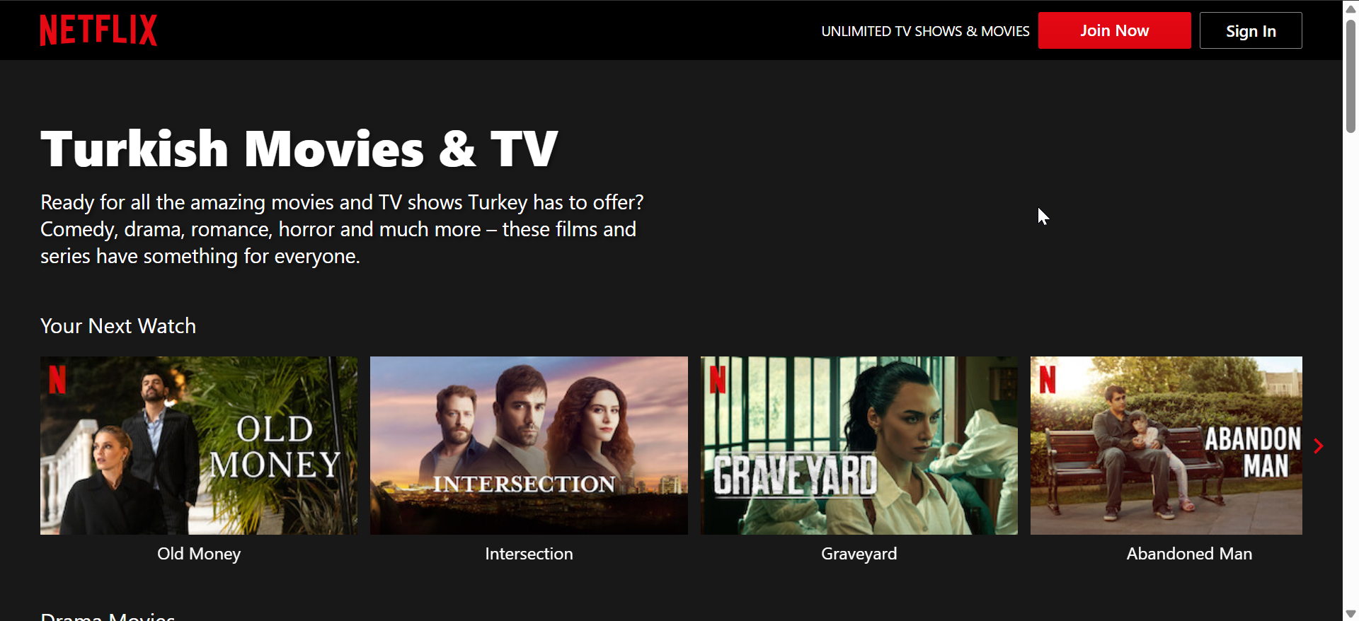 Netflixは、米国の視聴者に最もアクセスしやすいトルコ ドラマ カタログの 1 つを提供します。このプラットフォームには、Netflix オリジナル作品とライセンスされたヒット作が混在しています。組み込みのカテゴリと検索ツールを使用して、トルコのコンテンツをフィルタリングできます。
