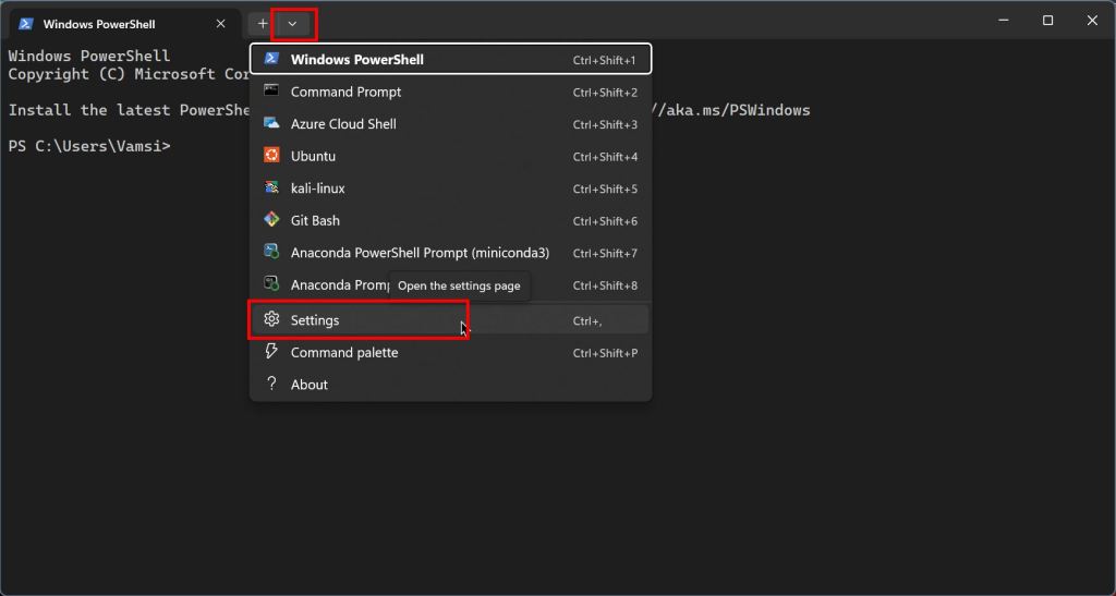 ターミナル ウィンドウを開いた後、タイトル バーの「ドロップダウン矢印」アイコンをクリックし、「設定」オプションを選択します。これにより、端末設定タブが開きます。