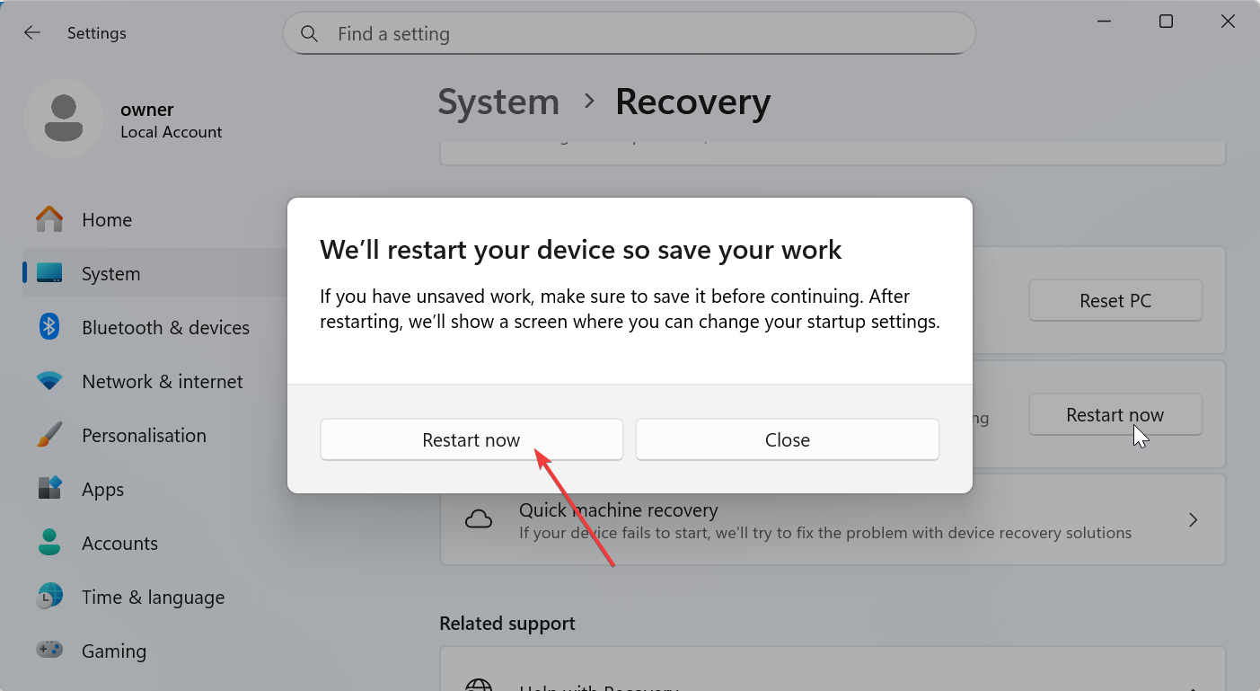 [設定] を開き、[システム] > [回復] を選択します。 [回復オプション] で、[今すぐ再起動する] を選択します。次に、[トラブルシューティング] を選択し、[詳細オプション] を選択します。