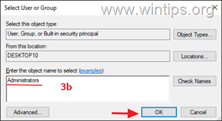 2d. [ユーザーまたはグループの選択] ウィンドウで、オブジェクトに「管理者」と入力します。名前を入力し、OK