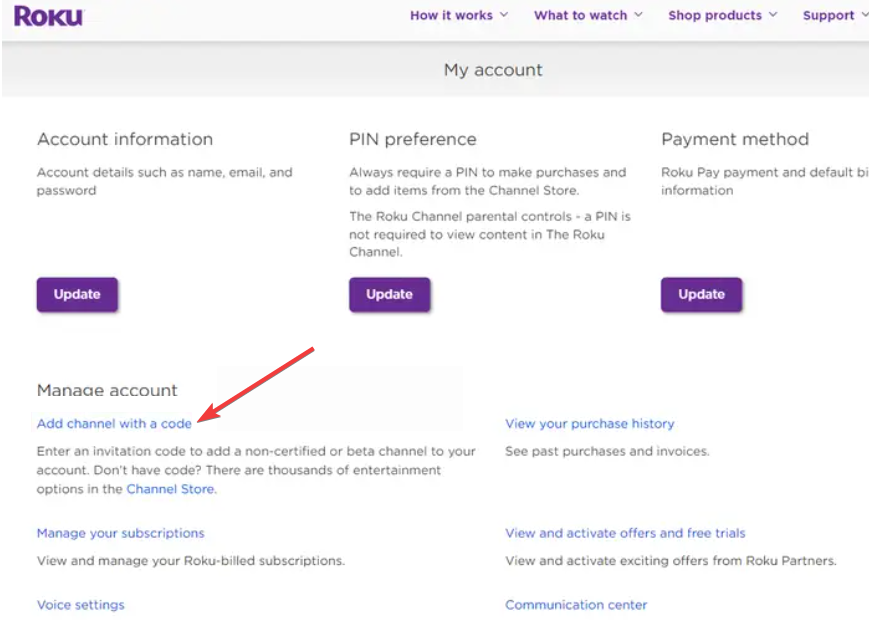 ブラウザを開いて、Roku アカウントにサインインします。次に、アカウント ダッシュボードで [コードを使用してチャネルを追加] を選択し、プライベート チャネルまたは非表示チャネルのアクセス コードを入力します。