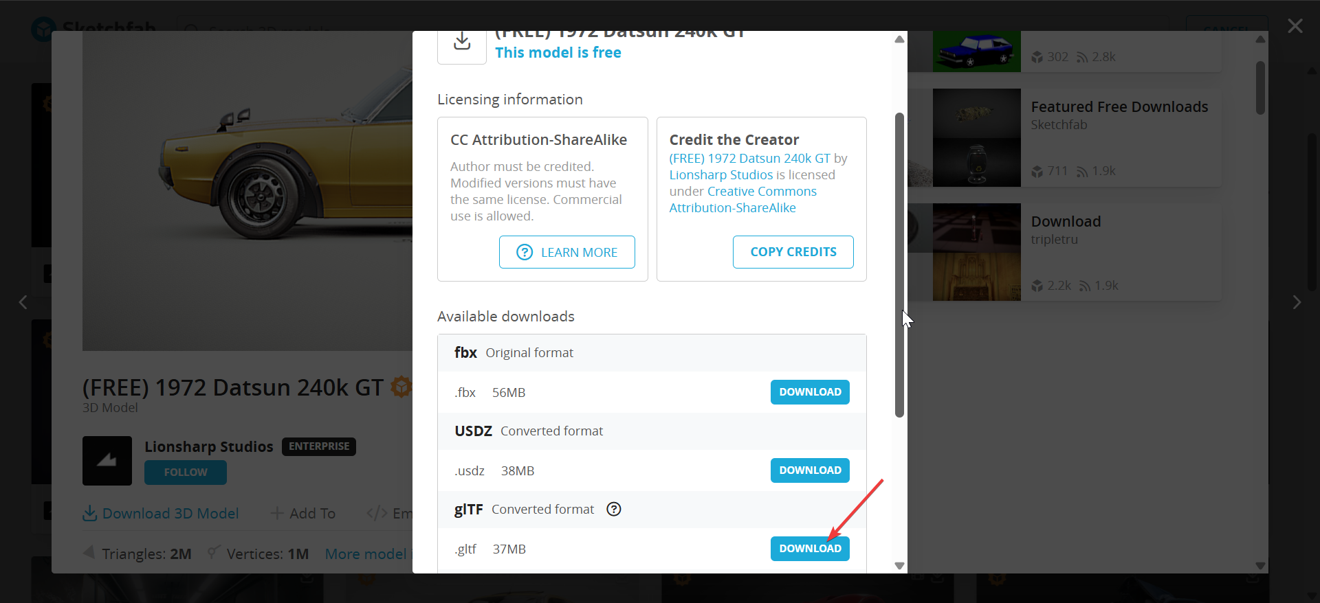 どこを見るべきか分かっていれば、Sketchfab モデルを数回クリックするだけでダウンロードできます。