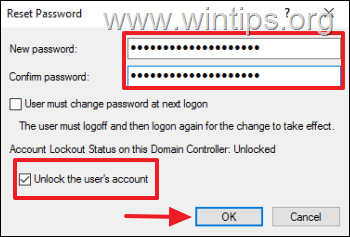 2. [パスワードのリセット] ウィンドウで、アカウントの新しいパスワードを入力し、ユーザーのアカウントのロックを解除するチェックボックスをオンにしてクリックします。 わかりました。