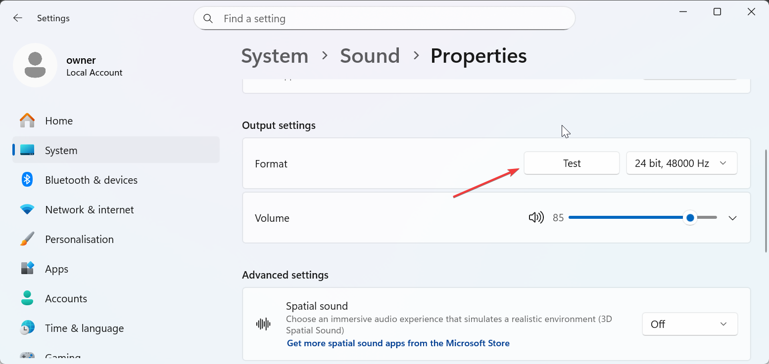 Windows でマイクをテストするのと同じように、スピーカーをテストできます。 Windows キー + I を押して、左側のペインで [システム] を選択します。次に、「サウンド」を選択し、出力デバイスをクリックします。次に、[出力設定] の下にある [テスト] ボタンをクリックして、テスト トーンを実行します。
