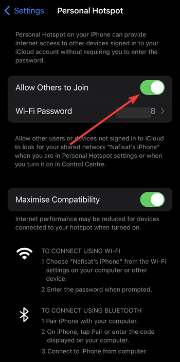 ホットスポット メニューでファミリー共有を許可することで、家族または複数のデバイスを許可することもできます。これにより、各デバイスでパスワードを繰り返し入力する必要がなくなります。