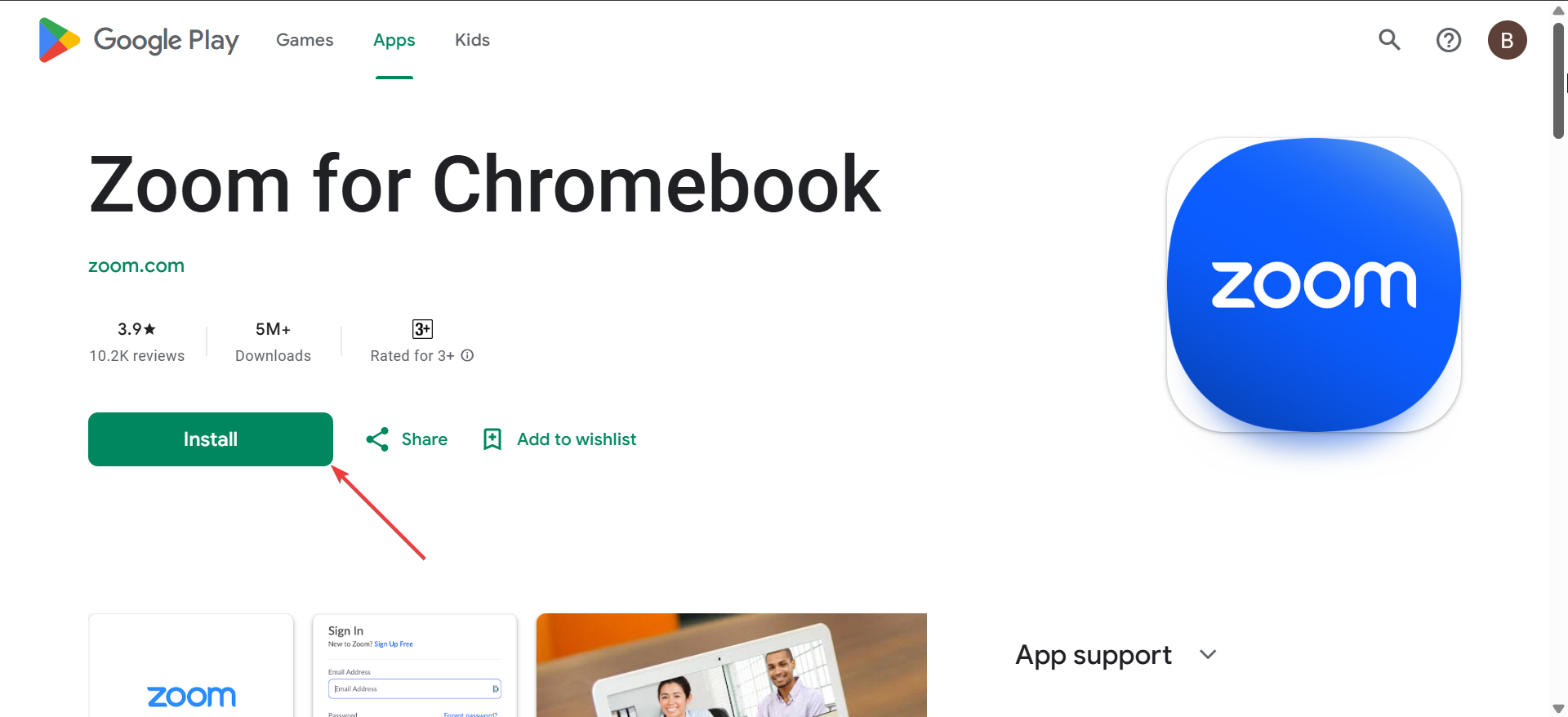 Google Play ストアを開いて、Zoom を検索します。 [インストール] をタップしてダウンロードし、Chromebook に追加します。