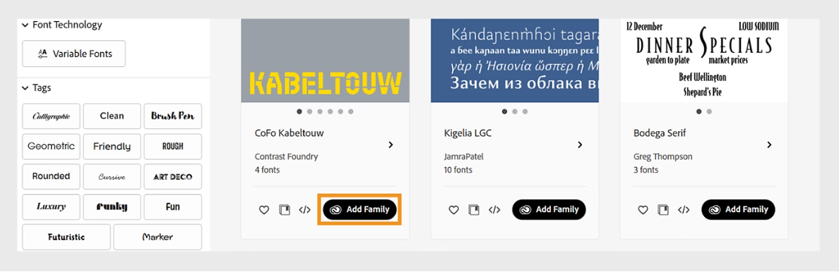Creative Cloud アプリを開き、左側のパネルでフォントを選択します。フォント リストを参照して、希望のフォントを選択します。最後に、[ファミリーを追加] ボタンをクリックします。