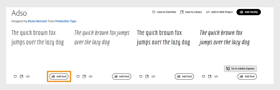 次に、必要なフォント ファミリを選択して開き、フォントの追加 ボタンをクリックして追加します。 Creative Cloud はフォントを自動的に同期します。